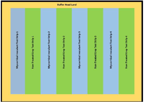 Figure 1: Trial plot set-up. At least four reps of inoculated and non-inoculated strips were planted at each plot site over a 5-acre area.