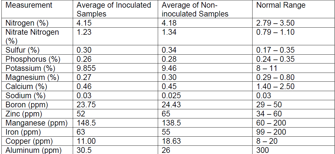 During the growth stage of the trials, tissue samples for both inoculated and non-inoculated crops were gathered and analyzed for comparison. Upon harvest, differences in yields between inoculated and non-inoculated strips were recorded to gauge the effect of the inoculant on crop productivity. All soil and tissue sample analyses were conducted by A&L Canada Laboratories in London, Ontario