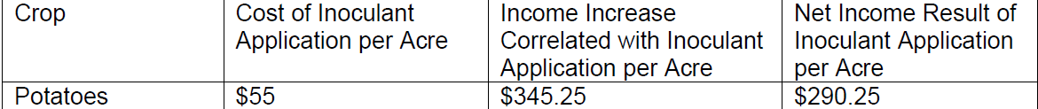 In 2021, the inoculated potatoes had a yield that was 6.67% higher than the non-inoculated potatoes. Applying that 6.67% yield increase measurement to the average income per acre of potatoes of $5176.25 would increase the income to $5521.50/acre, suggesting that inoculation results in an increase in income of approximately $345.25 per acre. Given the $55 per acre application cost of the inoculant, 6.67% yield increase measurement would result in a net increase in income of $290.25 per acre.