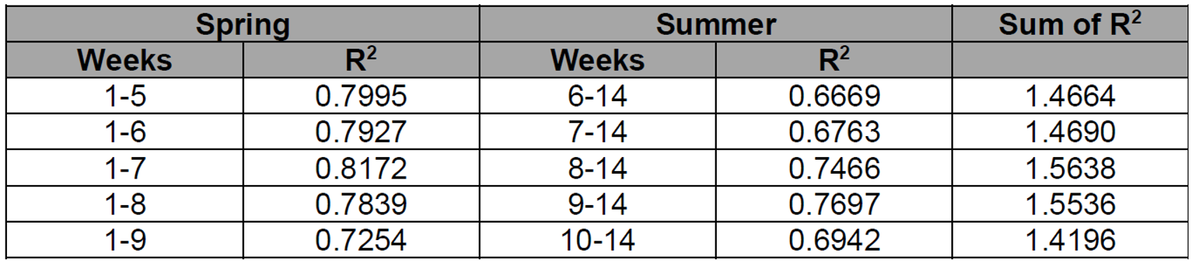 The spring and summer time periods with the highest correlation coefficients are weeks 1-7 (R2=0.8172) and weeks 9-14 (R2=0.7697) respectively. The spring + summer period with the highest summed correlation coefficients is weeks 1-7 + 8-14 (R2=0.7466), with a sum of 1.5638. This splits the 2019 sampling season into spring from May 12th to June 29th and summer from June 30th to August 17th. Table 1 summarizes the correlation coefficients for each period.