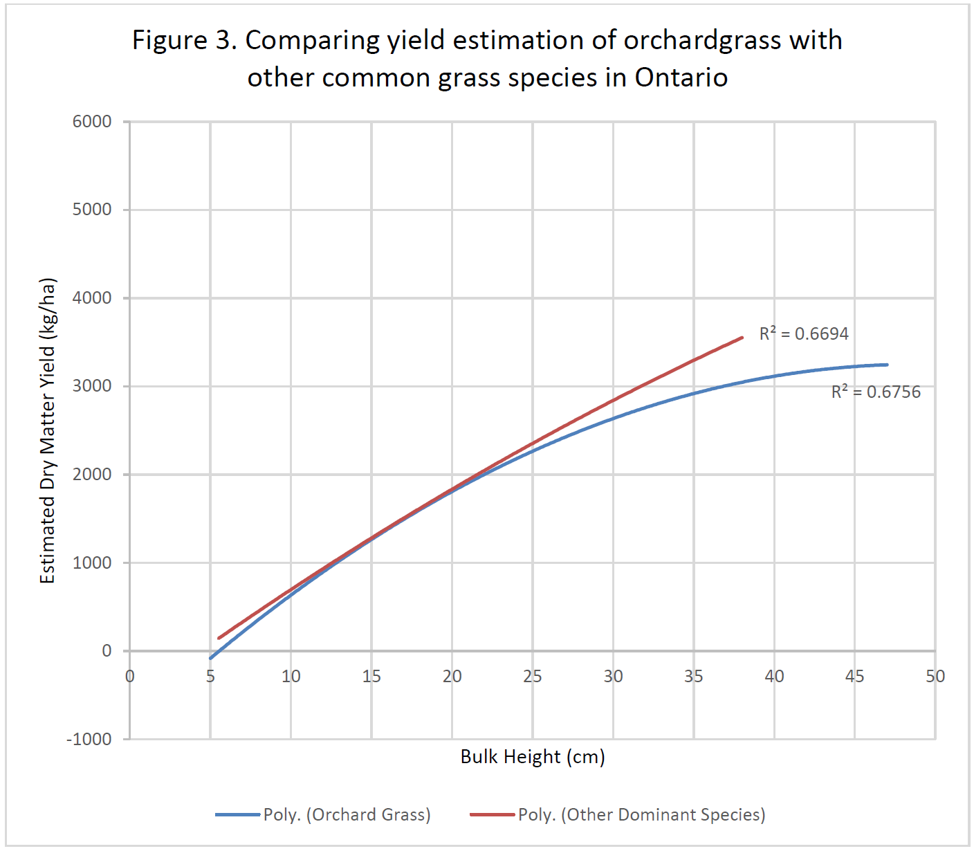 A major criticism of the falling plate meter as a pasture cover measuring tool for Ontario was the belief that tufts of thatch at the base of orchardgrass plants would cause the plate to overestimate cover. The correlation coefficients of models for all data, orchardgrass-dominated samples, and samples dominated by other grass species are numerically very close and indicate a moderately strong correlation between bulk height and cover. This suggests that the plate meter will be as accurate on orchardgrass-dominated pastures as on pastures comprised of other grass species.