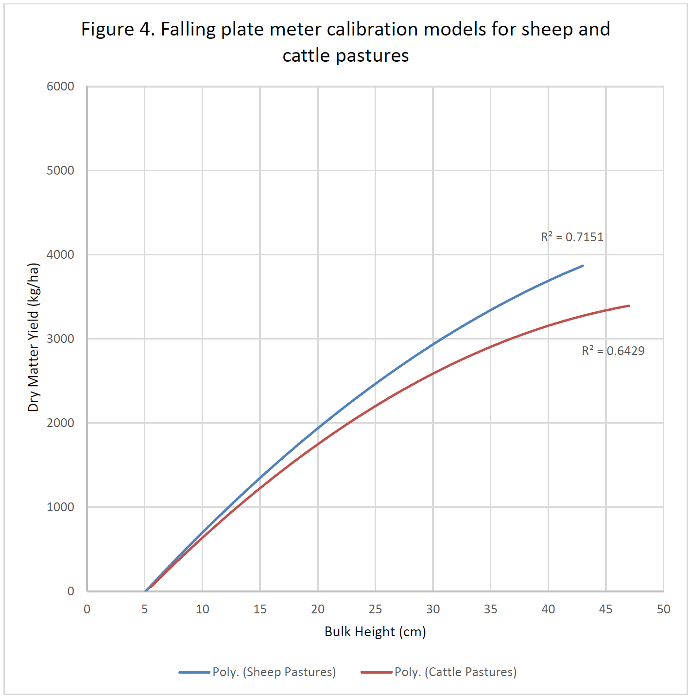The correlation coefficient for cattle pastures is R2=0.6429. The correlation coefficient for sheep pastures is R2=0.7151 (Figure 4). Slicing the data by livestock species strengthens the calibration equation for sheep pastures, but somewhat weakens the equation for cattle pastures compared to modelling all data together.