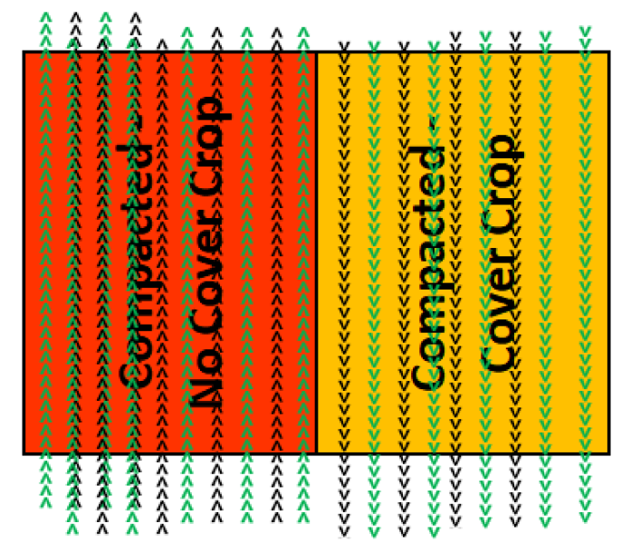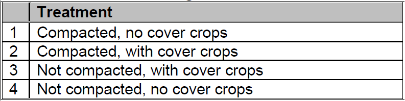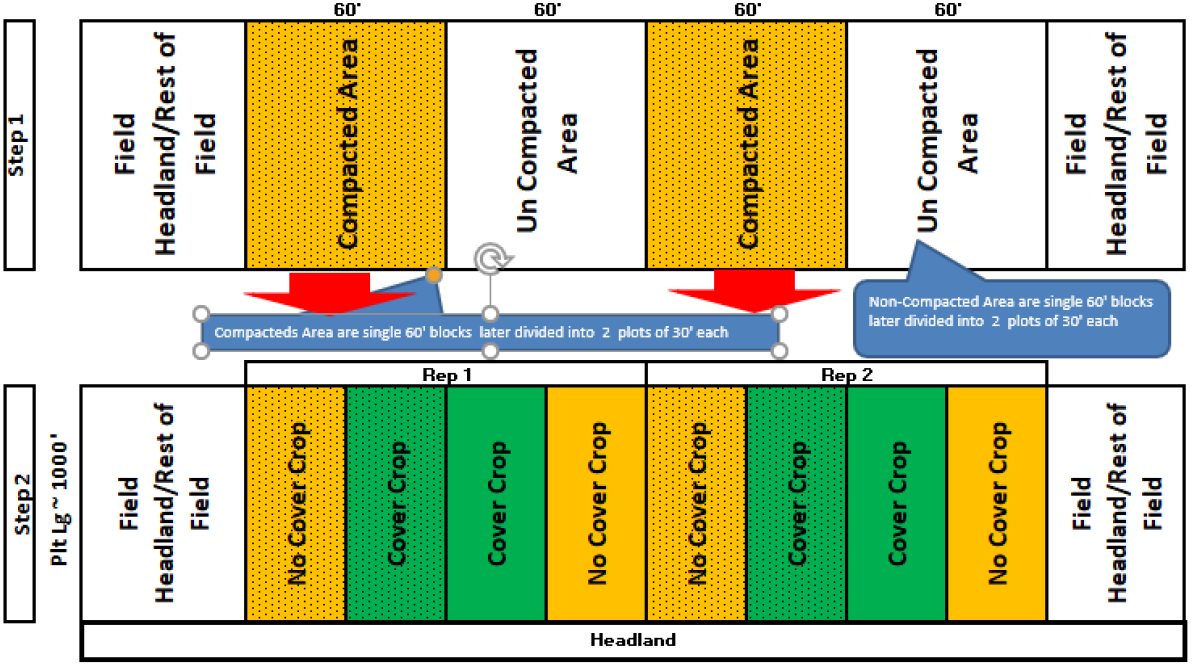 The compaction treatment blocks in figure 3 were installed in the fall of 2018. The plots were split in the spring of 2019 to establish the cover by compaction treatments in two replicates. The modified design to have cover and no cover treatments side by side between compacted and non-compacted treatments were done to facilitate equipment movement in the plot area.