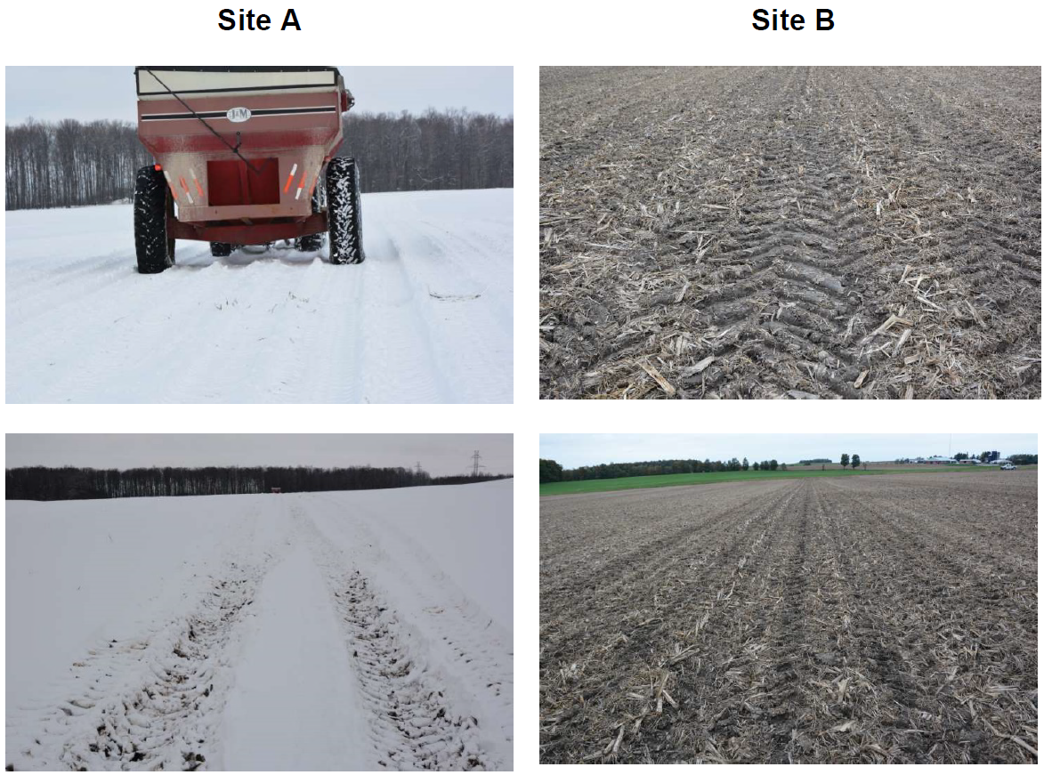 Figure 2. Compacted treatments applied by edge to edge field traffic from weighted implements, Site A Grain Buggy, Site B Combine.