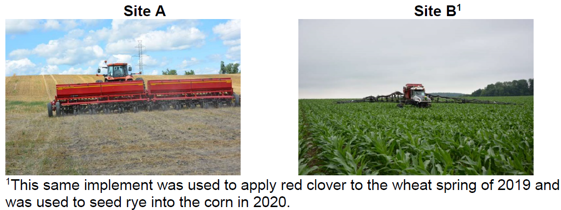 The treatments to be compared are summarized in tables 1 and 2. Cover crops were applied at Site A with a 30’ no till drill following wheat harvest (Figure 4) and at Site B with red clover using a modified Spray Coupe in early spring of 2019.