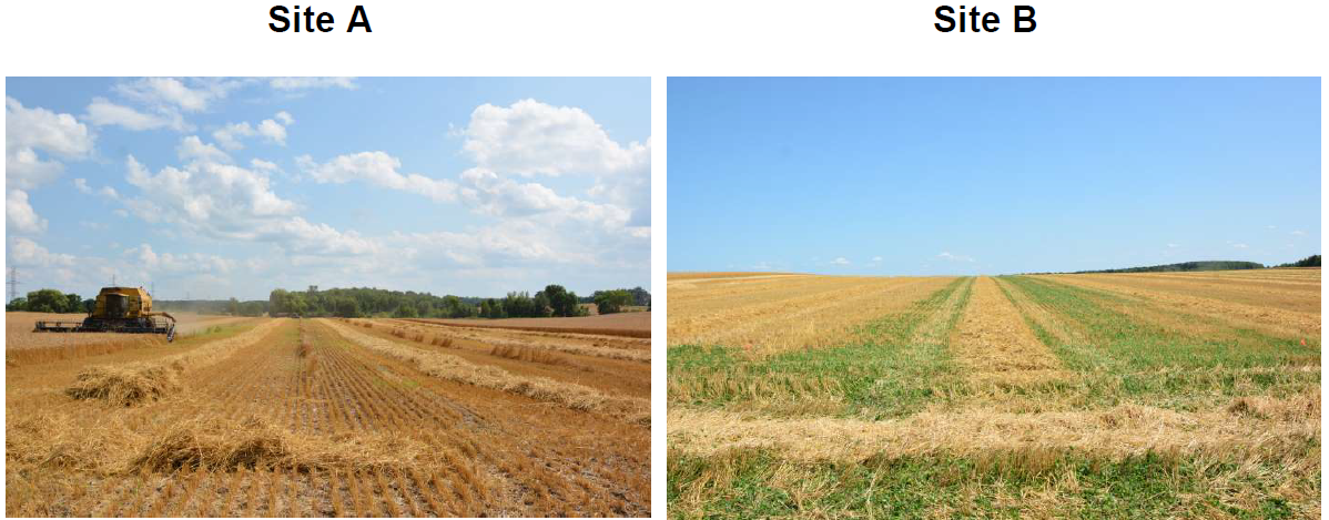 Figure 6. Conditions at wheat harvest. Site A, cover crops yet to be planted, Site A, red clover visible coming below the wheat canopy.