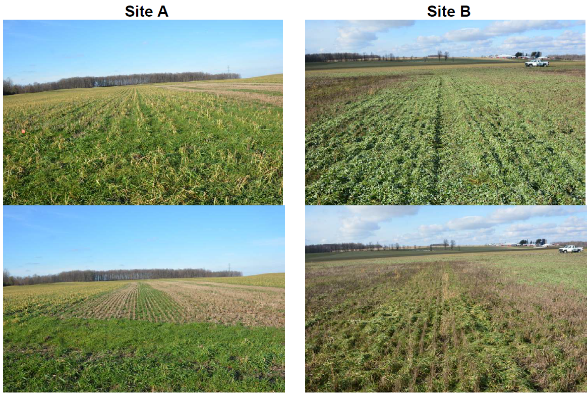 Cover crop left to grow following wheat harvest grew rapidly. By late fall there was good cover biomass in the cover crop plots at both sites (Figure 7). At Site A very little weeds grew in the non-cover crop plots except for some volunteer winter wheat. It was surprising to see the amount of weed growth that came in the non-cover crop plots at Site B. Essentially the entire non-cover crop plot area was completely covered by a relatively uniform distribution of weeds, which while not desirable, does offer ground cover and rooting that could be addressing compaction in the appropriate plots.