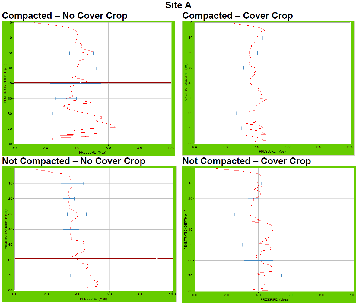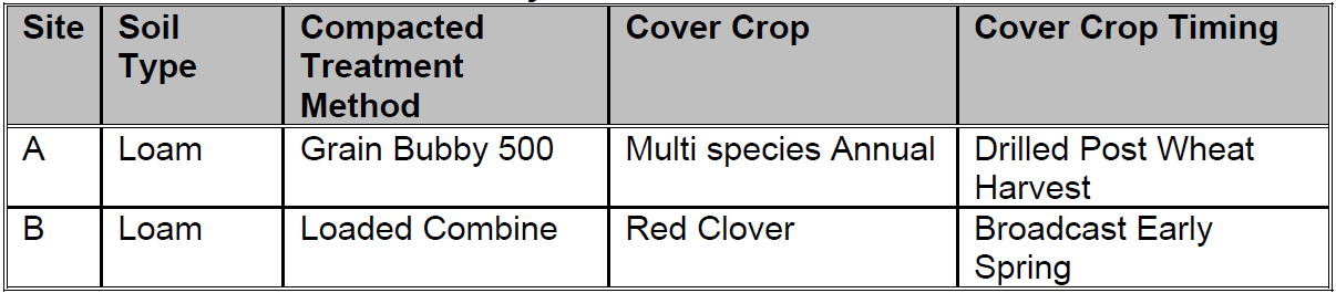 While this would not be normal, it gave the most likely comparison to show a compaction effect and thus enable an easier determination of whether the added cover crop treatments worked to alleviate the compacted effect. These compacted treatments occurred on November 29th at Site A and October 3rd at site B. In both cases the winter wheat had been previously planted, so the impact of tracking on the seeded wheat above and beyond the soil compaction effect needs to be accounted for. The field conditions were ones that given the implements used, the farmer felt were too soft for timing field operations which is what the target had been set for.