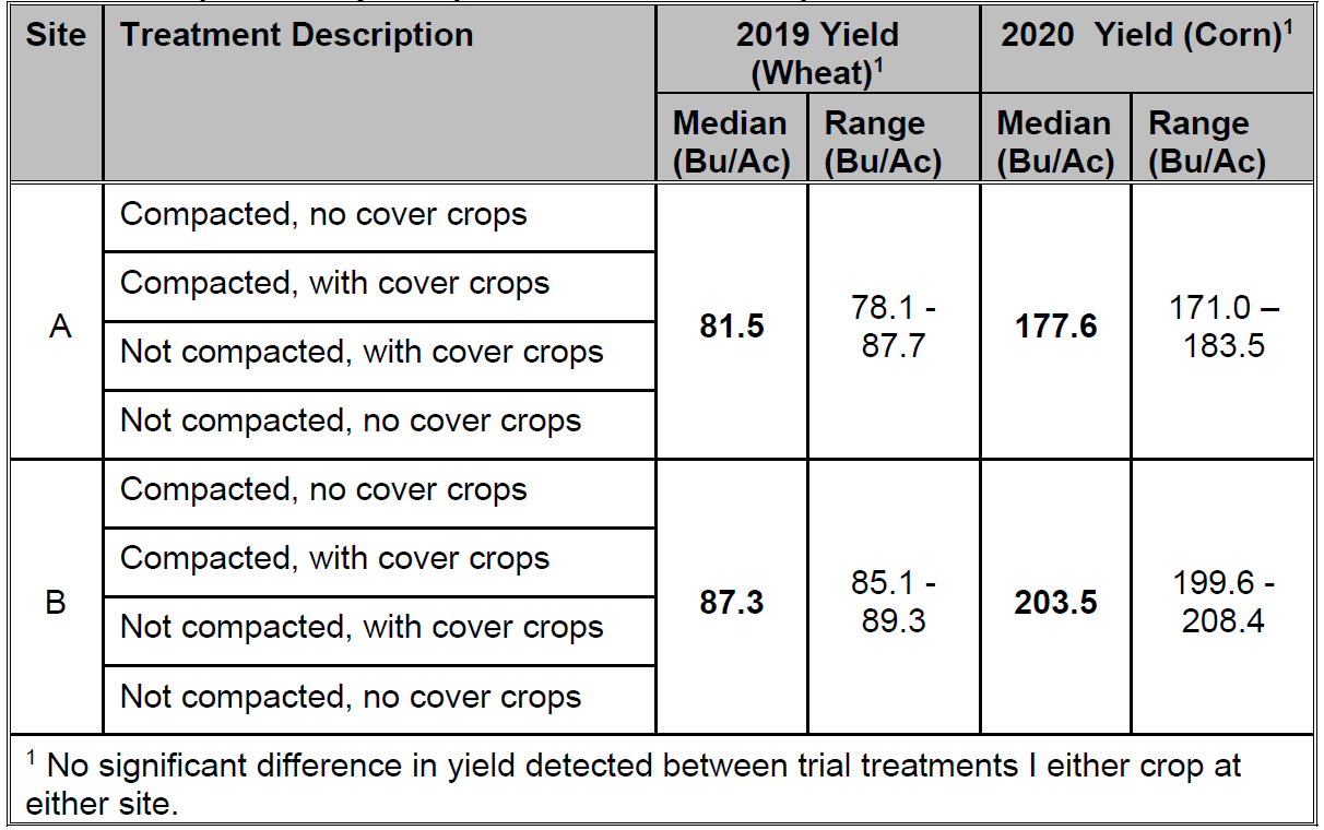 Crop yields were collected for winter wheat in 2019 and corn in 2020. No significant differences in crop yield were observed for either crop between compacted vs non compacted or with the cover crop treatments overlaid on the compaction plots.