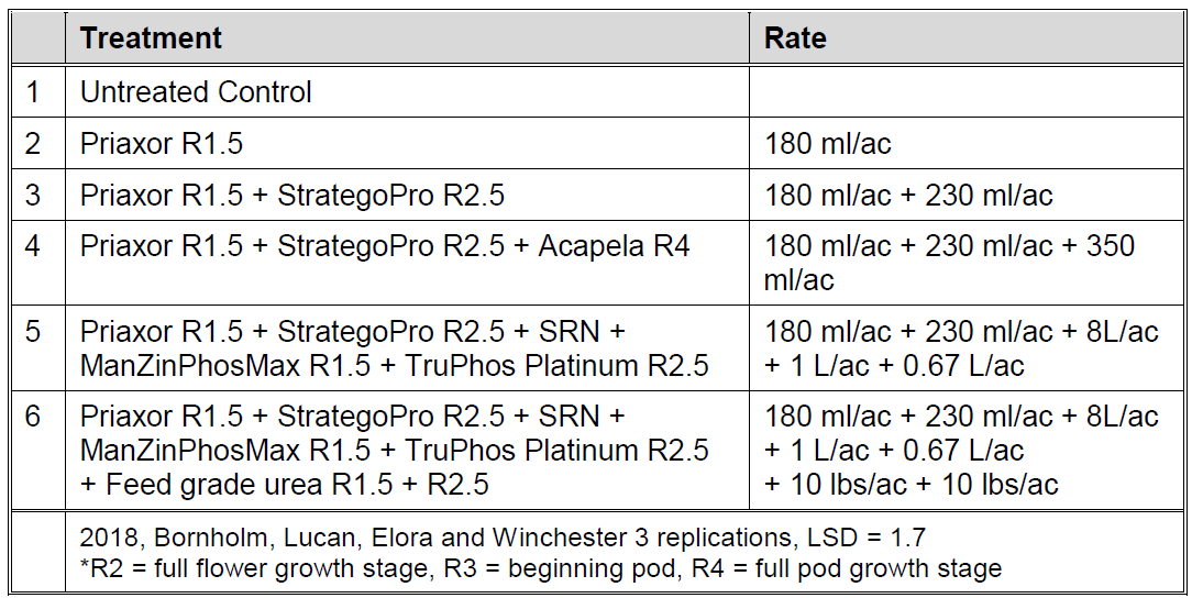 Six trials were conducted in 2018. Each had three replications. The locations of these trials were Bornholm, Lucan, Elora, Winchester, and Ridgetown. Two trials with difference varieties were tested at Bornholm.