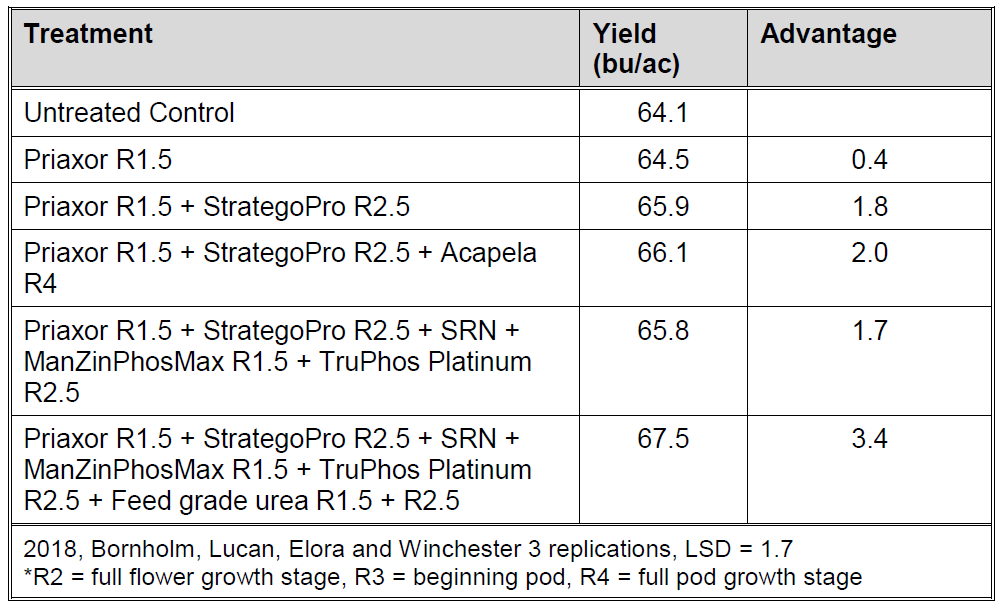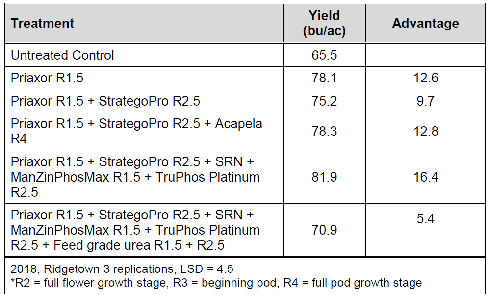 A positive yield response of 1.8 bu/ac was observed when Priaxor was applied at the R1.5 growth stage followed by a Stratego Pro application at the R2.5 growth stage. See Table #1. Three applications did not significantly increase yields over two applications. The addition of dissolved urea provided a small yield benefit.
