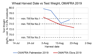 Figure 1: Impact of delayed harvest on test weight from winter wheat samples collected at Palmerston and Elora between August 2nd to August 23rd.