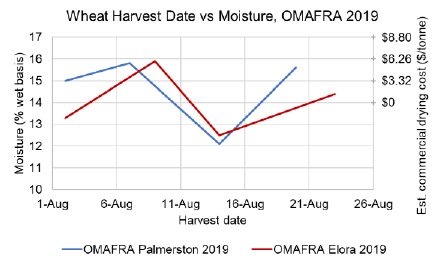 Figure 2: Moisture levels at harvest from winter wheat samples collected at Palmerston and Elora between August 2nd to August 23rd and estimated commercial drying cost.