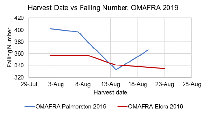 Figure 3: Impact of delayed harvest on falling number from winter wheat samples collected at Palmerston and Elora between August 2nd to August 23rd.