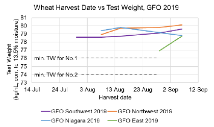 Overall the impact of delaying winter wheat harvest in 2019 was not as great as one may expect. These samples were collected over the course of four weeks when, even if there is a delay, growers are most likely able to get their wheat off within a matter of two weeks. The difference in quality at Palmerston in 2019 would not cover the costs associated with taking the crop off earlier and drying it on farm or having it custom dried. However, the late harvested samples at Elora would have been less costly to harvest early and pay for drying, than accept the low test weight discount. Fusarium at both locations declined over the course of the four weeks and DON was below the detectable limits.