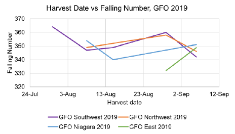 We also looked at falling number and found that samples collected in the southwest dropped from approximately 364 seconds to 342 seconds between July 30th and September 6th (Figure 5). In the northwest they dropped from 349 to 346 between August 8th and September 6th, in Niagara we saw a drop from 354 to 351 from August 8th to September 6th. In eastern Ontario we saw the opposite trend with falling number increasing from 332 seconds on August 29th to 349 on September 6th.