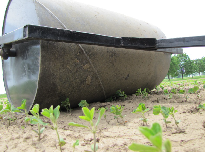 Land rolling helps conserve moisture and prepares the field for harvest. Rolling helps level the soil and pushes rocks into the ground, improving combine efficiency. Some producers roll immediately after planting, while others wait until the soybeans have emerged. Rolling immediately after planting provides improved seed-to-soil contact and reduces the likelihood of plant injury. However, it also increases the chance of soil crusting, which hinders soybean emergence. Soybean fields that are not rolled after the drill may emerge more quickly. If heavy rainfall occurs after seeding, rolled fields are more prone to crusting. To avoid these challenges some growers choose to roll their fields after beans have emerged. There have also been reports that early season stress from post emergent rolling may shorten internodes, stimulate early season growth, increase pod number, thereby increasing yields.