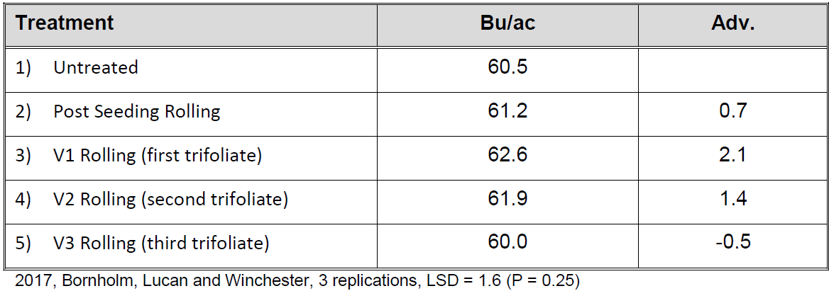 1. A small yield gain was observed when soybeans were rolled at the V1 (first trifoliate) leaf. The statistical confidence of this yield gain was weak so further research will be necessary to determine if this gain is repeatable.