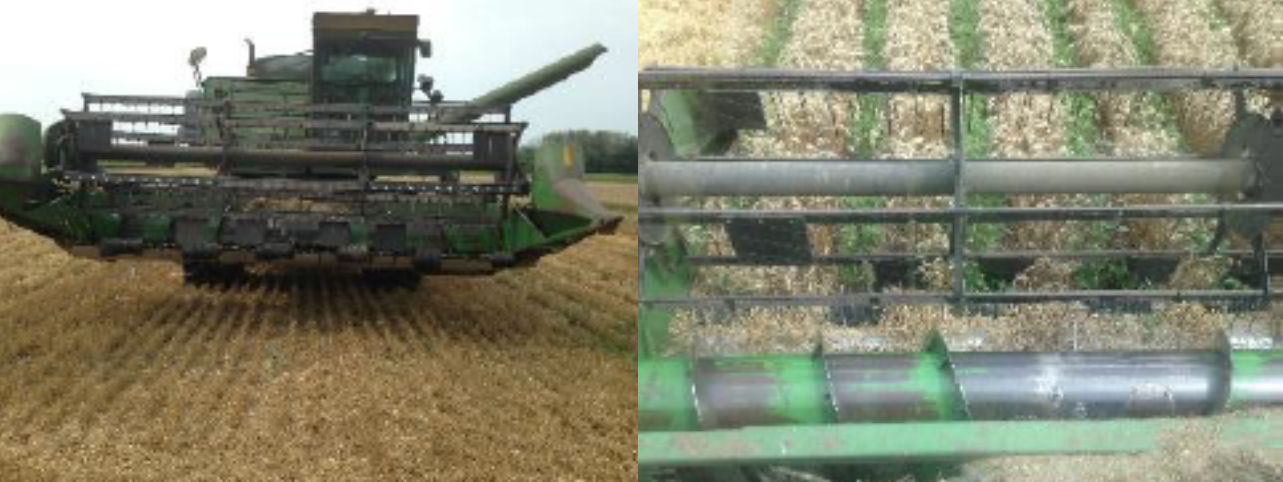 Soybeans were inter-seeded into the wheat using a 3pt hitch no-till drill. The soybeans were planted in 30” rows in between the twin rows of wheat (Image 1). The extra row units on the drill were removed so they wouldn’t damage the wheat. To harvest the twin row wheat with soybeans interseeded pieces of 6” drainage tile were cut to slide over the cutter bar on the header to prevent the soybeans from getting clipped (image 2).