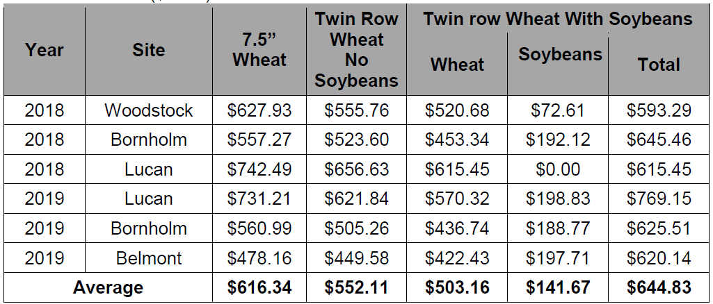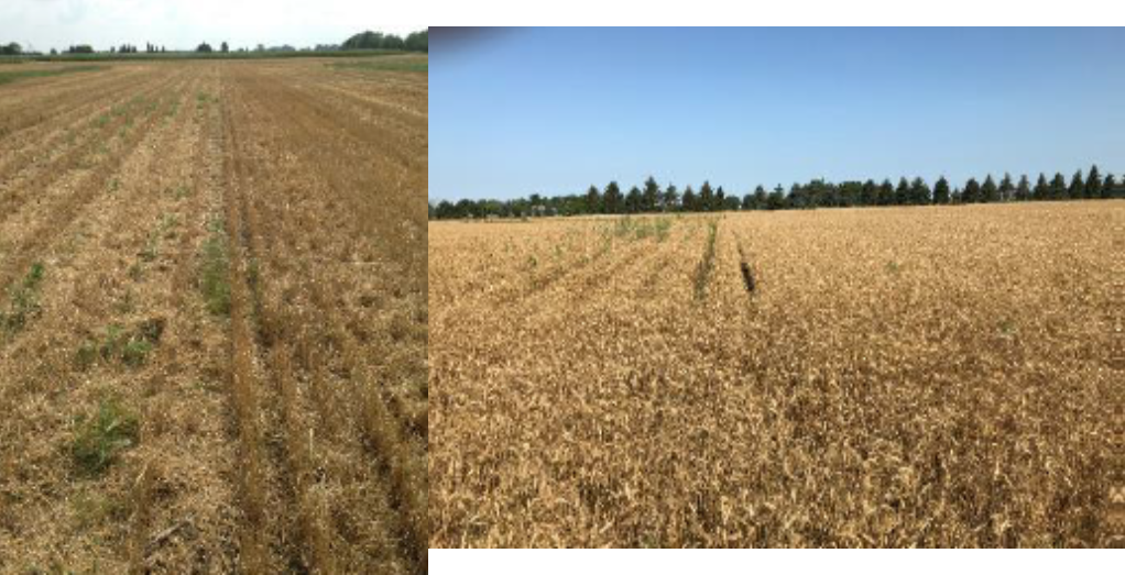 It is important to note that the twin row wheat contained many more weeds then the 7.5” wheat (image 4). The value of crop canopy cannot be overlooked when evaluating cropping systems. As well, planting relay soybeans into the wheat crop drastically limits the herbicide options that can be used in the wheat crop. While all treatments had a herbicide applied prior to wheat planting, the herbicide options that are registered both in winter wheat and pre-plant in soybeans is extremely limited. In some cases there may be problem weeds that are not controlled by these herbicides. At the Belmont location in 2019, grass weeds were particularly problematic in the twin row and relay soybean treatments. In the solid stand of wheat, crop competition provided essentially 100% control of grass weeds. In this case, an additional herbicide cost would need to be included with the relay soybean economics.