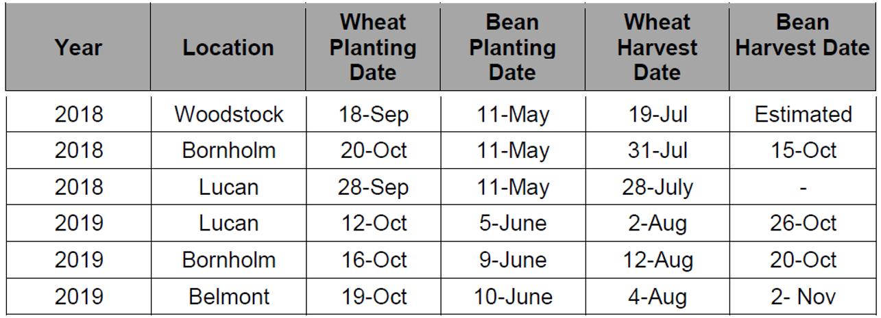 The planting and harvest dates for the wheat and beans are shown Table 2. In 2018 the beans were all planted on May 11th, while in 2019 planting was delayed until June due to wet field conditions.