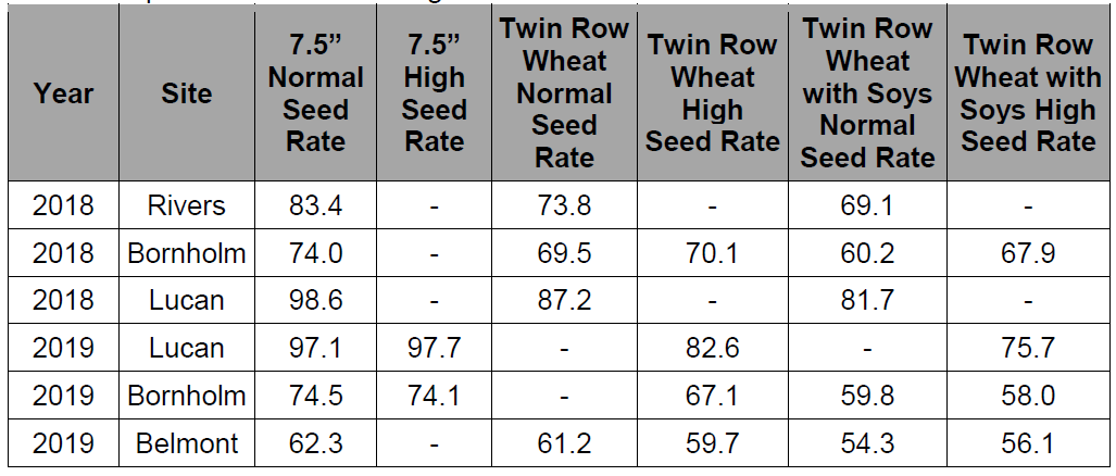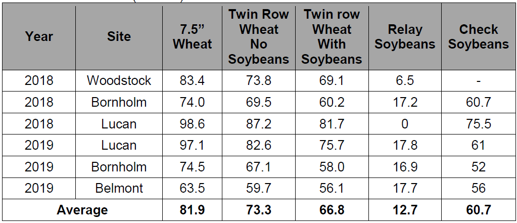 The spring of 2019 was extremely wet which resulted in poor and variable wheat stands at both the Bornholm and Belmont locations. At the Bornholm location there were areas within the plots where the wheat was completely killed out. Overall soybean seed quality was good with moisture’s ranging from 15% to 17%. However, at the Bornholm site in 2019 the soybeans were still green, and at harvest had a bad odour. The soybeans planted at Bornholm were the same maturity as the field soybeans at that site, so the difference in seed quality was surprising and showed the impact of the wheat competition on the relay soybeans. At both Belmont and Lucan in 2019, longer season soybeans were planted to try to maintain flowering beyond the timing of wheat harvest. At both of these sites soybean seed quality at harvest was fine, although seed moisture was high, and soybean maturity was extremely late.
