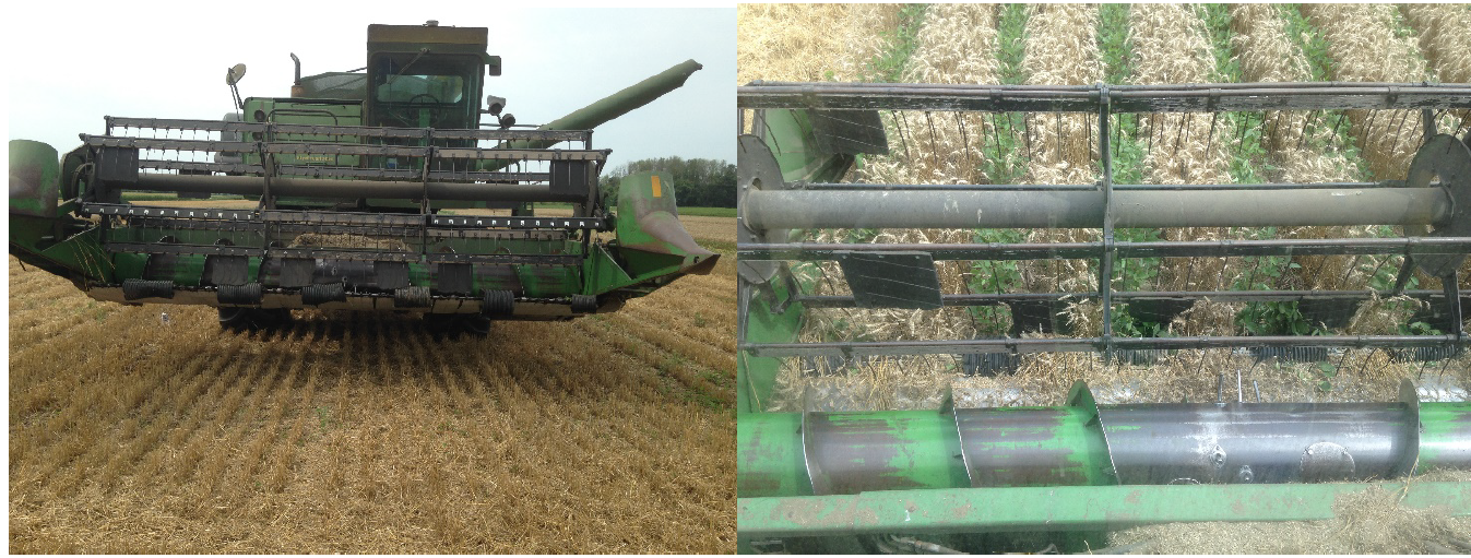 Soybeans were inter-seeded into the wheat using a 3pt hitch Tye Series 4 no-till drill with row units removed, to drill only into the interrow spaces. The soybeans were planted in 30” rows between the twin rows of wheat (Image 1). To harvest the twin row wheat with soybeans interseeded pieces of 6” drainage tile were cut to slide over the cutter bar on the header to prevent the soybeans from getting clipped (Image 2). This header configuration was not perfect, but very little wheat was missed at most locations.