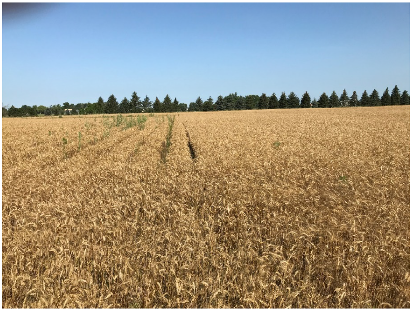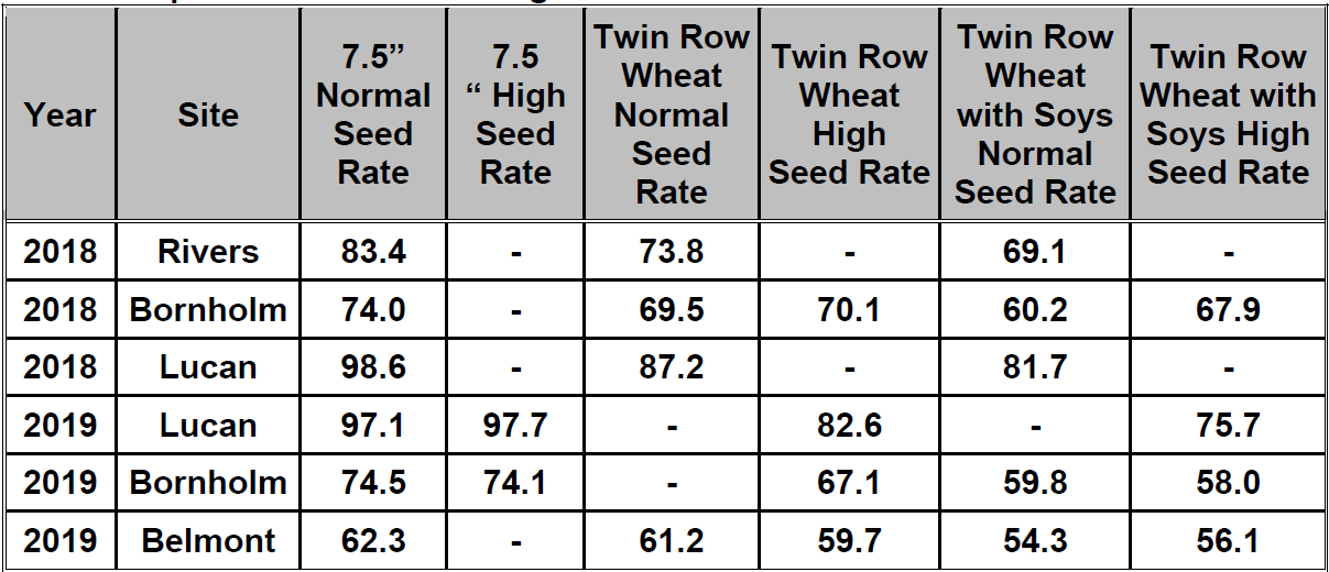In 2020 the Lucan location again suffered from drought conditions during June and July, causing death of about 1/3 of the relay soybean plants, with the remaining relay soybeans aborting flowers and resulting in almost no pods. Extreme winds from a severe storm (tornado confirmed nearby) just prior to wheat harvest caused lodging in the twin row wheat with relay soybeans, which made harvesting the two crops separately impossible. It should be noted that only the twin row wheat with relay beans lodged. The twin row wheat without soybeans, and 7.5” row wheat had zero lodging from the tornado force winds. As the surviving soybeans had essentially no pods, the soybeans were abandoned and all wheat harvested by cutting wheat and soybeans at ground level during wheat harvest. The soybean crop at Bornholm looked promising early on, but did not develop post wheat harvest and yield results were very poor.
