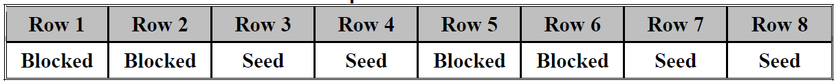 - Twin row winter wheat (two paired 7.5" wheat rows on 30" centres, leaving a 21" gap)