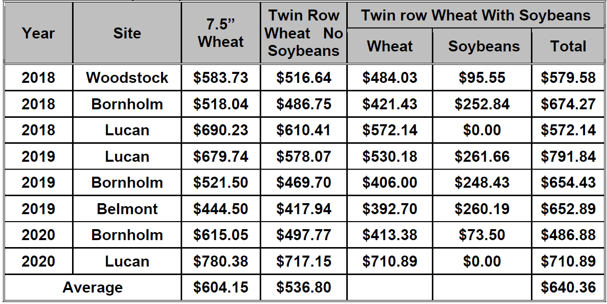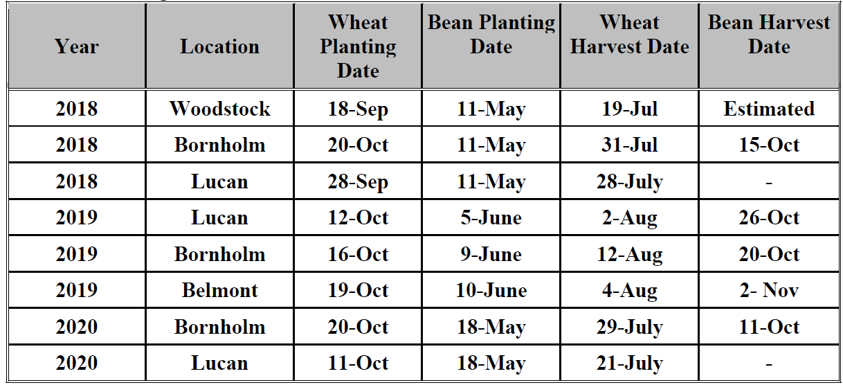 All treatments received 120 to135 lbs of nitrogen and 12 to 15 lbs of sulphur per acre in the spring. All sites were sprayed with herbicide before the soybeans emerged, except for the Bornholm location in 2020. At this location the beans had started to emerge before herbicide application was accomplished, thus no herbicide was applied. All sites received a T3 fungicide across all treatments, including onto the soybeans.