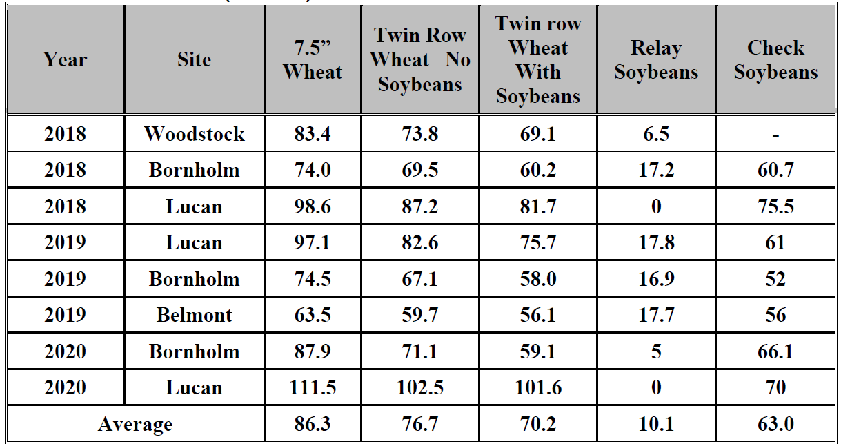 The other factor that became apparent over the course of the project was the selection of wheat variety. Lucan consistently had the most challenges with the relay soybeans, and 2 out of 3 years the soybeans died in the wheat canopy. The wheat variety used at Lucan was 25R34, which has an extremely planophile (prostrate) leaf architecture. 25R74 was used at Foldens and Belmont, which has an upright leaf architecture. Cruze was used at Bornholm, which has an intermediate leaf architecture. For growers considering adopting a relay cropping system, choice of wheat variety for upright leaf architecture, plus delayed planting of both wheat and soybeans will increase the probability of success.