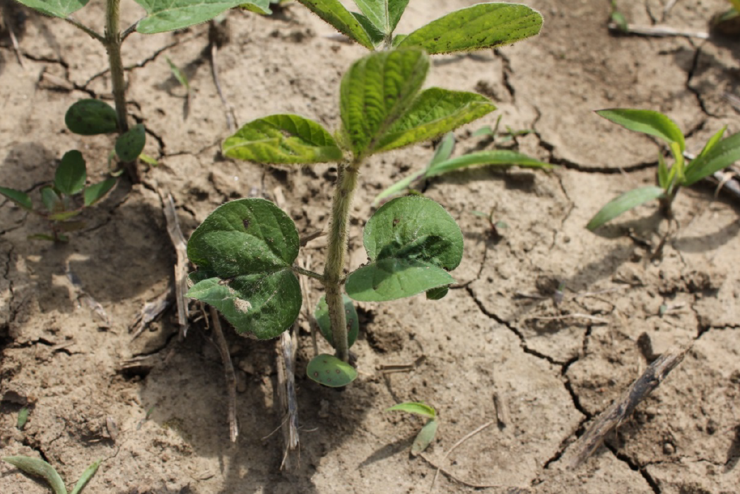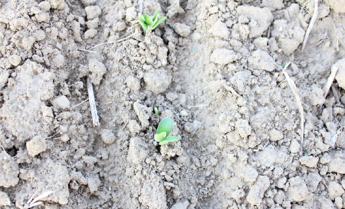 Figure 3. When herbicides were applied at 9 days after planting, approximately 40% of the soybean crop had emerged and were at the cotyledon stage. The soybeans could be “rowed” easily as you walked by the plots.