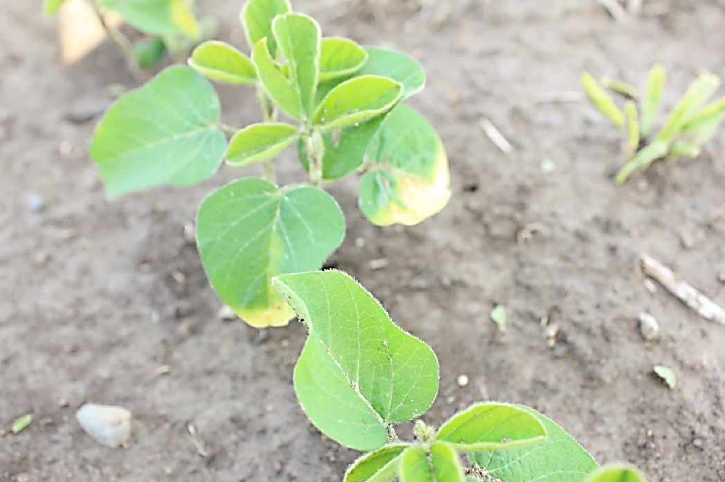 Figure 7. Sencor 75 DF injury to soybean seedlings, yellowing of the unifoliate leaf margins, eventually turning brown and defoliating, when applied 9 days after planting.