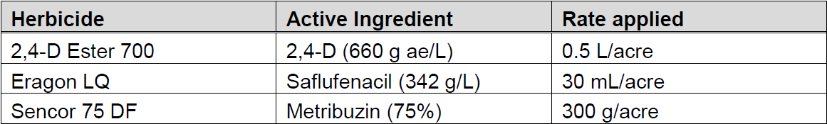 The soybean variety P05T24R (glyphosate tolerant) was planted on June 3, 2017 in 15” rows with a Kinze planter at a depth of 3 cm and at a seeding rate of 190,000 seeds/acre. Three herbicides were applied at 4 different timings following planting (Tables 1 and 2). A control plot was included in which no burndown treatment was applied. A blanket application of glyphosate (540 g/L) at 1 L/ac was applied at the 3rd to 4th trifoliate stage to control any weeds that had emerged after planting. Visual crop injury was taken at 7 and 14 days after planting (DAA), plant populations were taken at 28 days after planting and soybeans were harvested on October 3, 2017.