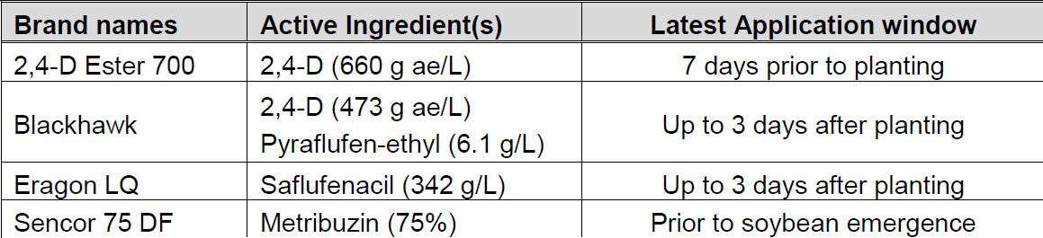 Table 3. Herbicide brands, their active ingredient(s) and application restrictions of common soybean burndown herbicides.