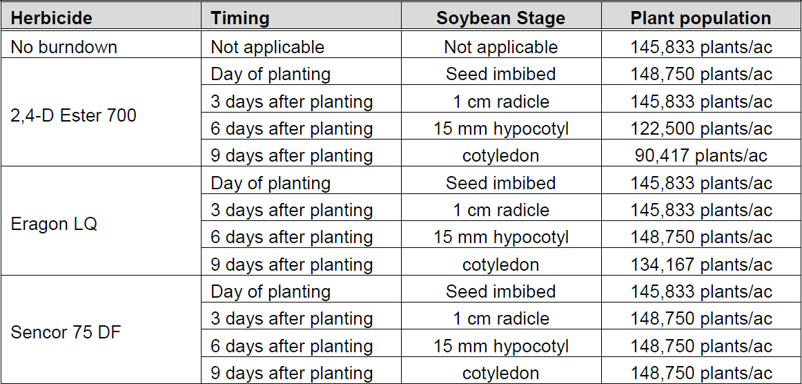 Since approximately 40% of the soybean stand was emerged and at the cotyledon stage when herbicides were applied at 9 days after planting, crop injury was greatest and plant populations were lowest at this application timing. Applications of 2,4-D Ester 700, Eragon LQ or Sencor 75 DF made within 3 days after planting did not appear to affect plant population when compared to the non-burndown control (Table 4). When 2,4-D Ester 700 was applied at 6 and 9 days after planting soybean populations decreased by ~15% and ~40% respectively. With Eragon LQ, plant populations decreased by ~8% when applied at 9 days after planting. Sencor 75 DF did not alter plant populations regardless of application timing.